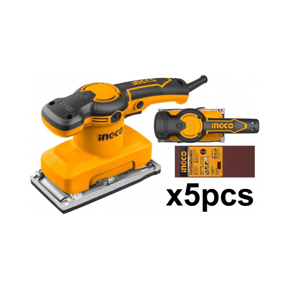 La levigatrice orbitale INGCO FS3208 ha un impugnatura soft grip per un pratico utilizzo, la possibilità di cambiare le spazzole in maniera facile e veloce e può vantare un ottimo rapporto qualità - prezzo. La levigatrice orbitale professionale INGCO 320W FS3208 ha incluso nel kit 5 fogli abrasivi.