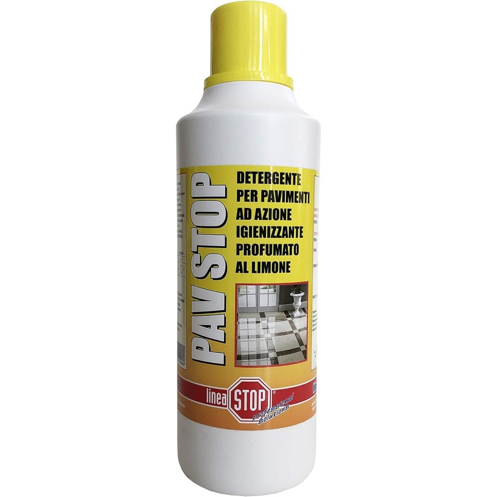Detergente per pavimenti ad azione igienizzante profumato al limone, PAV STOP pulisce a fondo ogni tipo di superficie dura: pavimenti, rivestimenti ceramici, marmo, superfici igienico-sanitarie.